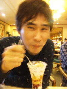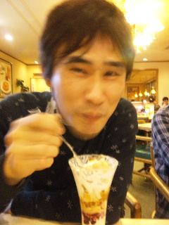 この写真は2次会のファミレスでまーぶるがキャラメルなんとかパフェを食べてる所です。みごとに残しやがりました。